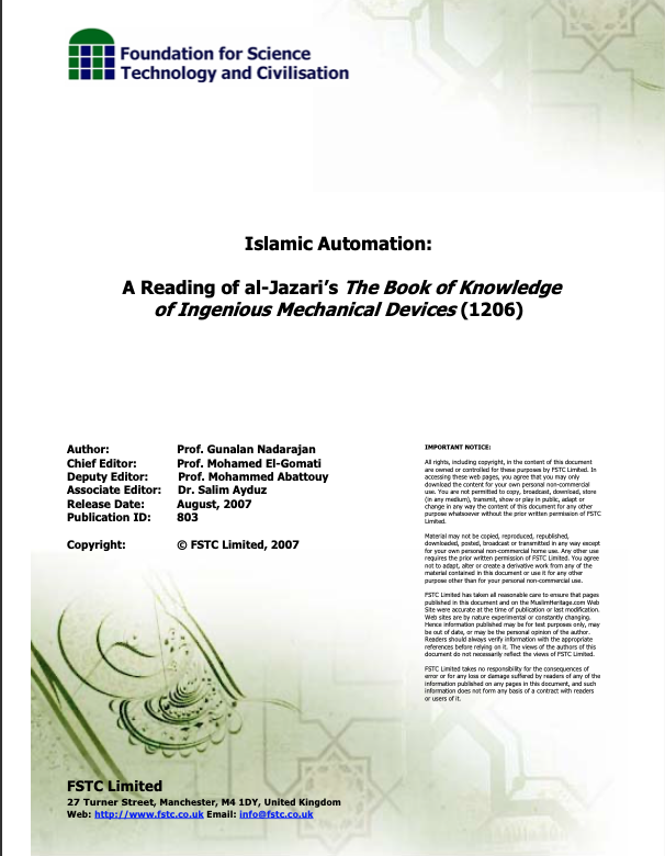 - Ismail al-Jazari. The Book of Knowledge of Ingenious Mechanical Devices, 1206. Translated by Donald R. Hill. Routledge, 1996.